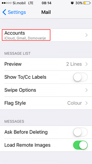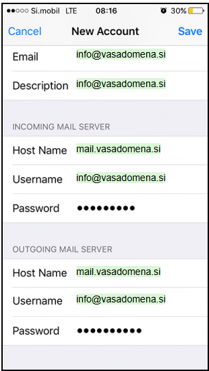 Incoming mail server: Host name: mail.vasadomena.si Username: info@vasadomena.si Password: vpišite vaše geslo za dostop do poštnega predala.